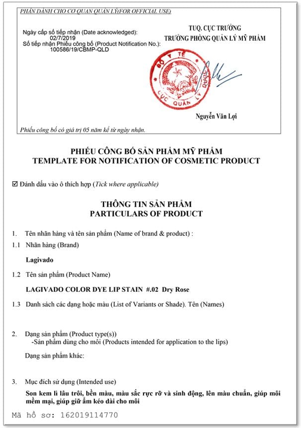 Đây là Phiếu Công bố sản phẩm Son kem lì Lagivado do Bộ y tế cung cấp